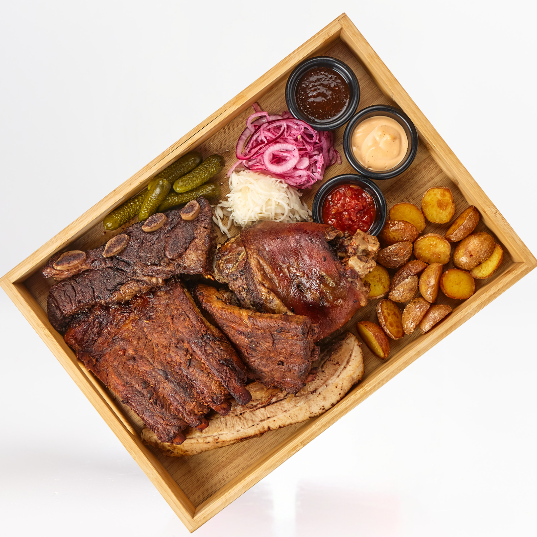 говяжьи ребра кальби, свиные ребра барбекю, свиная рулька, свиная грудинка пастрами на кости, квашенная капуста, запеченный картофель бэби, огурцы маринованные, соус черно-перечный, соус барбекю, соус гриль