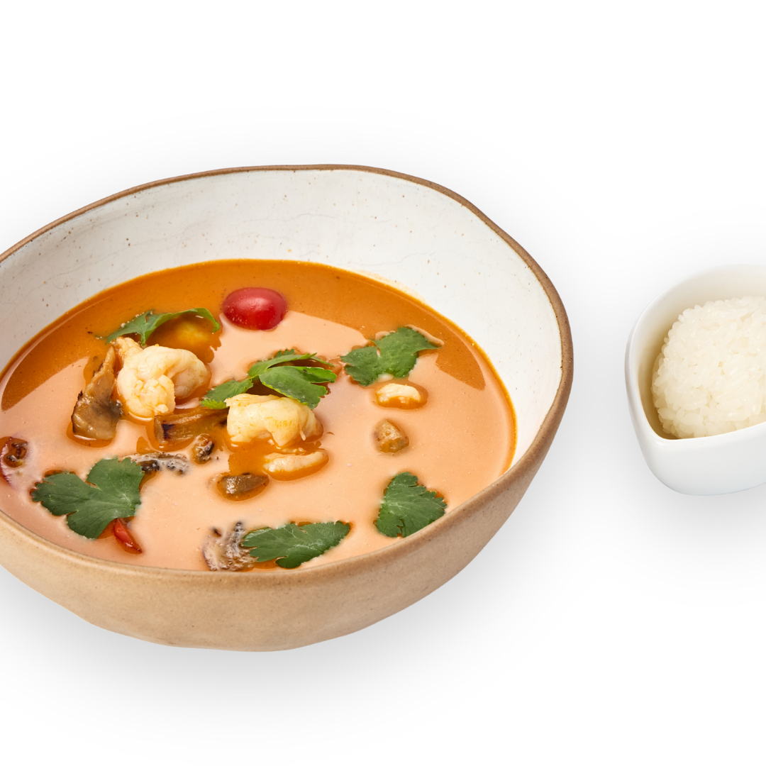 бульон Том-Ям, молоко кокосовое, креветки тигровые, куриное филе, помидоры черри, шампиньоны, перец чили, кинза, рис